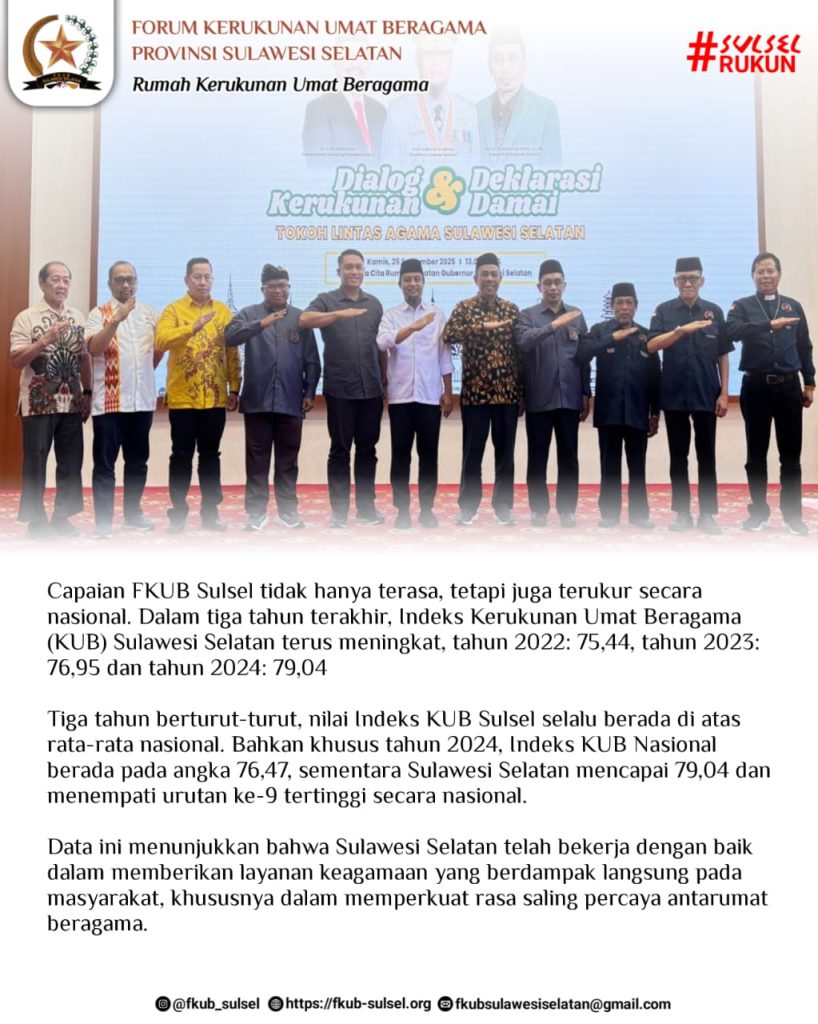 Capaian FKUB Sulsel tidak hanya terasa, tetapi juga terukur secara nasional. Dalam tiga tahun terakhir, Indeks Kerukunan Umat Beragama (KUB) Sulawesi Selatan terus meningkat, tahun 2022: 75,44, tahun 2023: 76,95 dan tahun 2024: 79,04