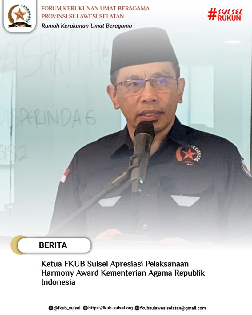 Makassar, fkub-sulsel.org., Ketua Forum Kerukunan Umat Beragama (FKUB) Provinsi Sulawesi Selatan, mengapresiasi pelaksanaan Harmony Awards yang dilaksanakan oleh Kementerian Agama Republik Indonesia melalui Pusat Kerukunan Umat Beragama Kemenag RI.
