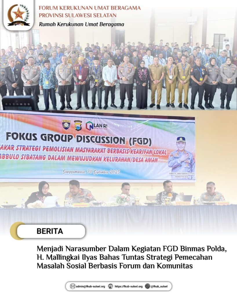 FGD ini menghadirkan sejumlah narasumber dari internal dan eksternal Polri. Salah satu narasumber eksternal dari Forum Kerukunan Umat Beragama (FKUB) Provinsi Sulawesi Selatan. Tampil sebagai narasumber adalah H. Mallingkai Ilyas, Lc., C. Med., Wakil Sekretaris Forum Kerukunan Umat Beragama (FKUB) Sulsel, dengan materi Strategi Pemecahan Masalah Sosial Berbasis Forum/Komunitas.