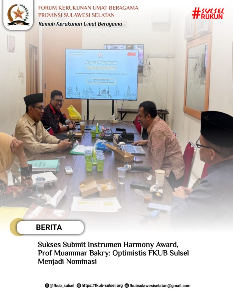 Makassar, fkub-sulsel.org., Forum Kerukunan Umat Beragama (FKUB) Provinsi Sulawesi Selatan optimis menjadi nominasi Harmony Award Kementerian Agama Republik Indonesia. Setelah sukses melakukan pengisian instrument Harmony Award, FKUB Provinsi Sulawesi Selatan secara otomatis menjadi peserta dalam ajang penganugerahan kerukunan bertaraf nasional yang dilaksanakan oleh Kementerian Agama Republik Indonesia melalui Pusat Kerukunan Umat Beragama. Submit instrument Harmony Awards berlangsung di Kantor FKUB Sulsel, Jumat (10/10/2025).